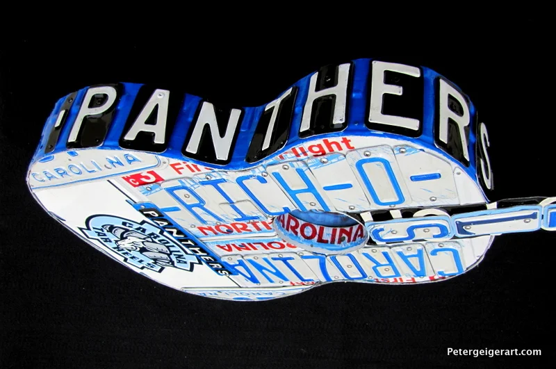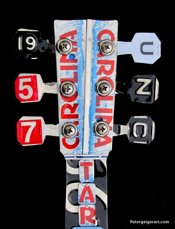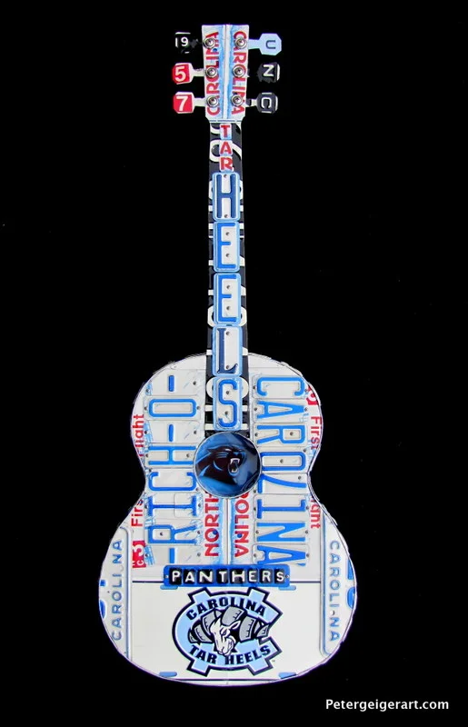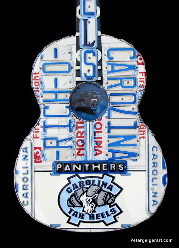 This license plate guitar art was handcrafted for a diehard Tarheels and Panthers fan. My Charlotte-based client sent me a few of his tags that he'd been saving for years, as well as emblems to work with. His name is Rich O, which I featured on the face.
