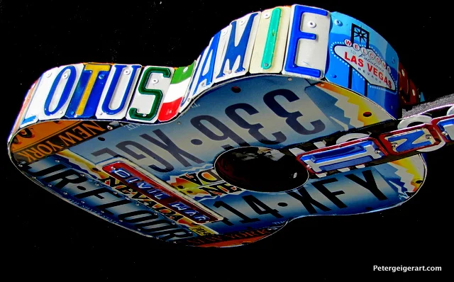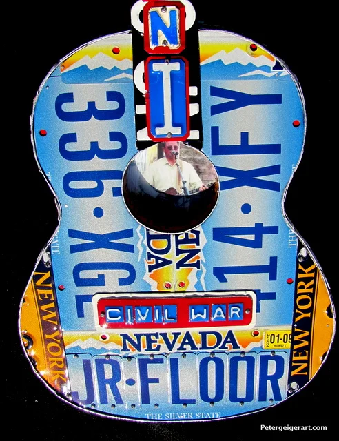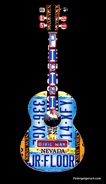I used colorful tags from Nevada and New York, wrote their last name down the neck, and featured the names of his loved ones around the body of the guitar. Civil War is displayed on the bridge. Michelle and Jamie sent me the photo that appears in the center, which shows their dad at one of his gigs. As always, it is fun to get to know my clients by creating their life stories through my highly personalized guitar art.