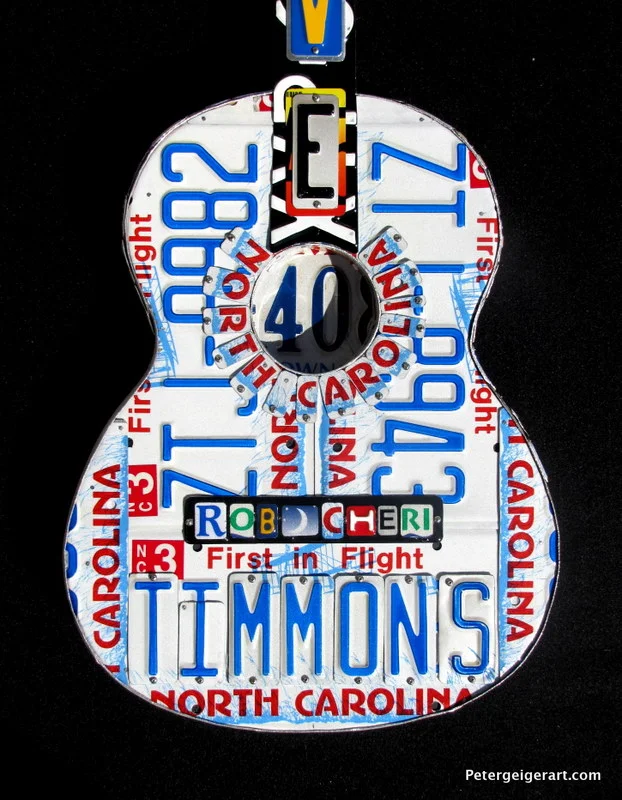 I crafted this license plate guitar art for my client who will present it to him on his 40th birthday. The guitar art features tags from NC, GA, VA, MD, and Washington DC. Their name is featured on the body.